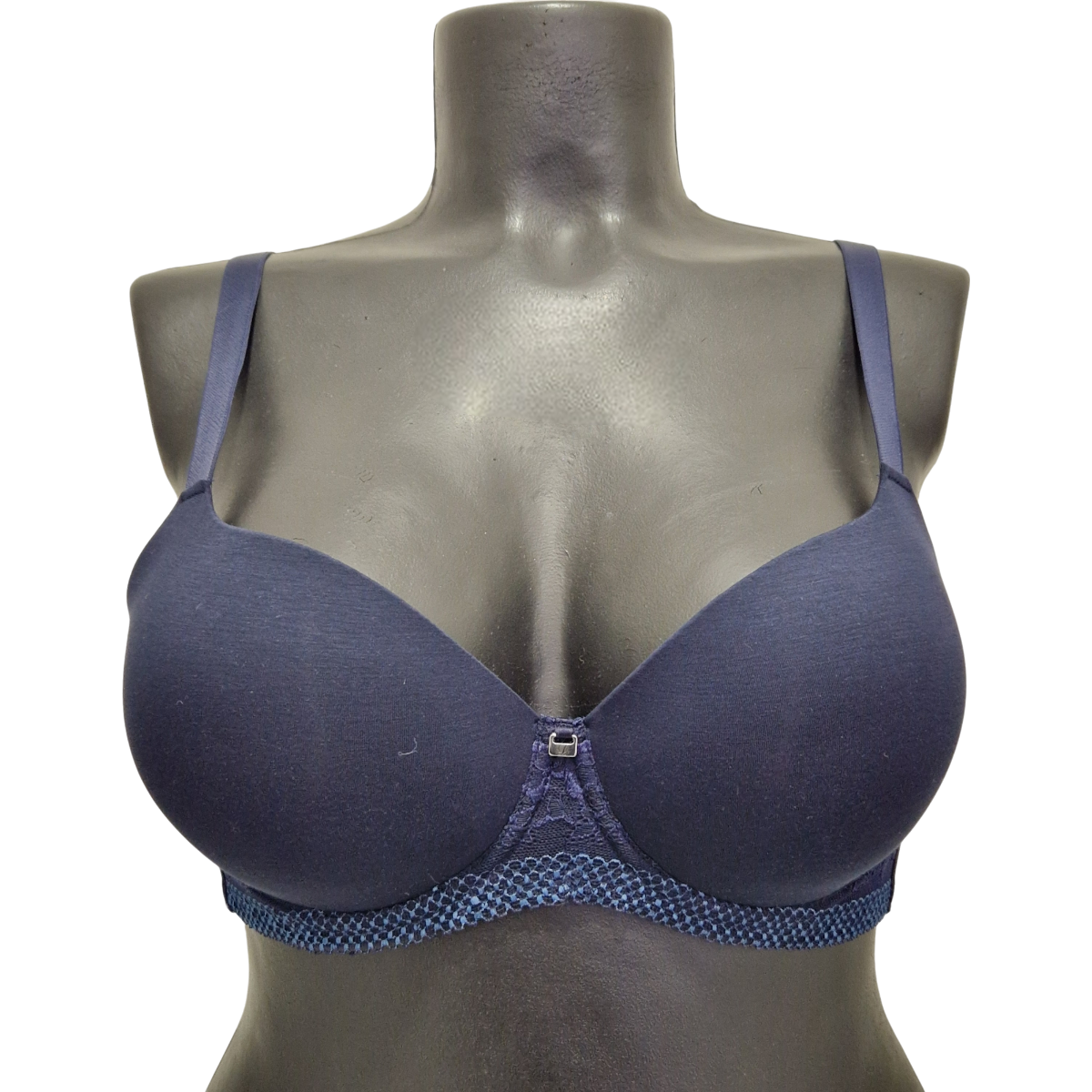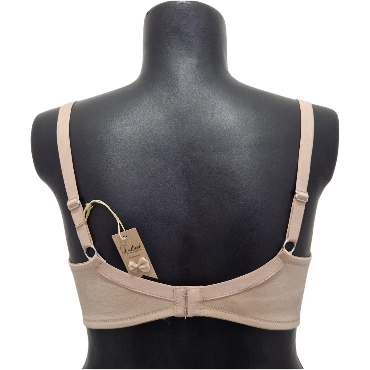 Modrček z oblikovanimi košaricami in s kostjo izdelan iz naravne trajnostne tkanine tencel. Košarice niso dodatno podložene. Košarice so prekrite s tankim elatičnim zelo mehkim blagom. Na sredini je širši in s tem bolj objame prsi in je bolj zaprt. Naramnice so elastične in nastavljive. Podprsni obseg je narejen z elastičnim mehkim blagom. Modrček je idealen tudi za pod tanke majice saj košarice so gladke. Na sredini in pod košaricami ima prišito tanko čipko, katera daje dodatno eleganco.