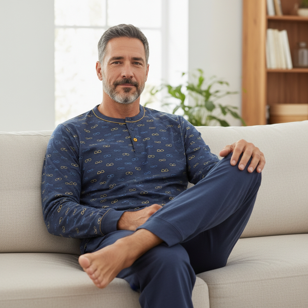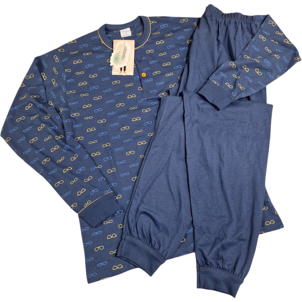 Moška pižama dolg rokav narejena iz prijetnega 100% tankega bombaža jearsey, ki je zelo mehak na otip. Pižama ima na okroglem vratnem izrezu zašite 3 gumbe ter je na rokavih in dolžini hlačnic zaključena s patntom.
