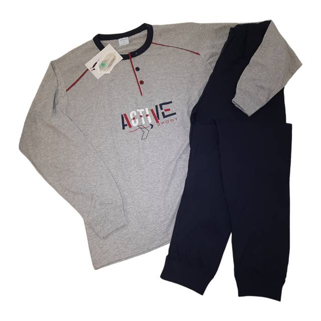 Tanka moška pižama dolg rokav narejena iz 100% bombaža. Rokavi in hlače so zaključene s patentom. Na vrhnjem delu ima prišite 3 gumbe, ki se po potrebi lahko odprejo. Hlače imajo na vrhnjem delu pri straneh prišita žepa.