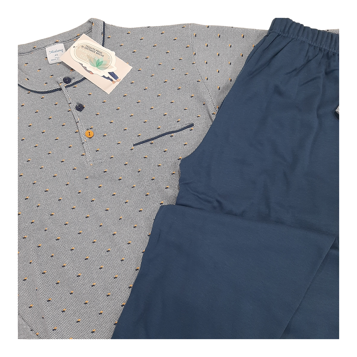 Topla moška pižama dolg rokav narejena iz prijetnega debelejšega bombaža (interlock). Pižama ni skončana s patentom ne na rokavih kot tudi na hlačnicah. Na vrhnji strani pod okroglim izrezom ima prišite 3 gumbe. Vrhnji del ima na sprednji levi strani prišit majhen žepek. Na otip je mehka in prijetna.
