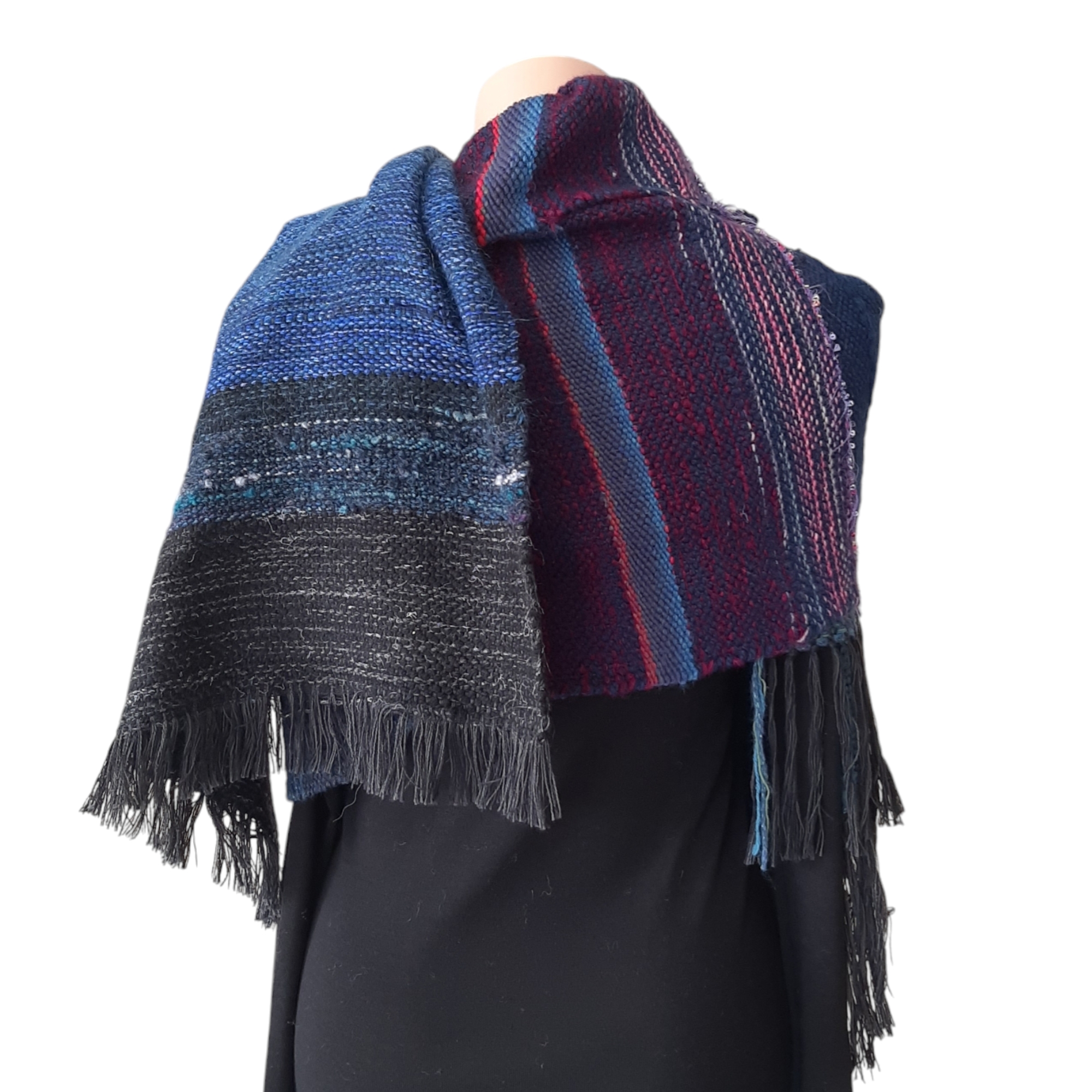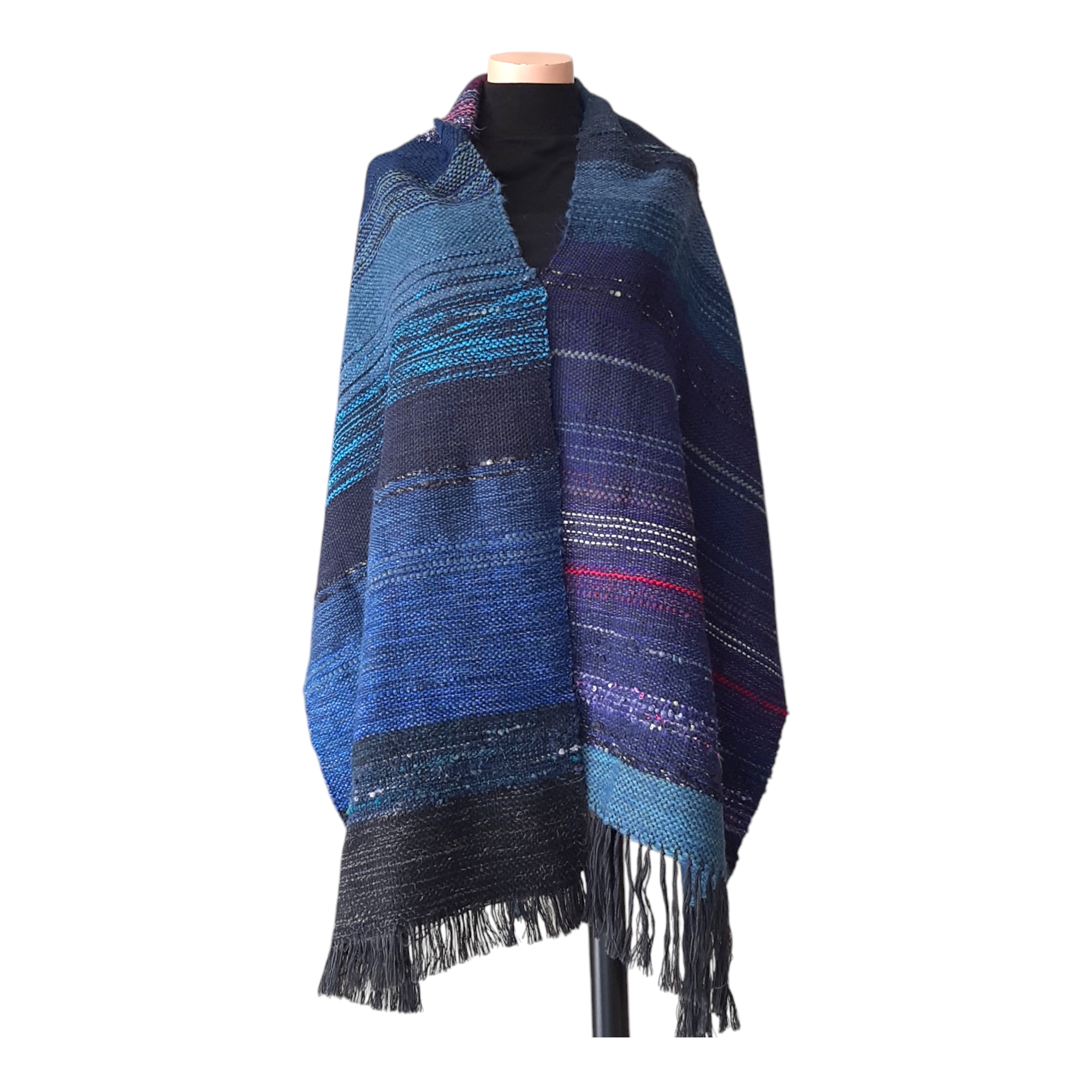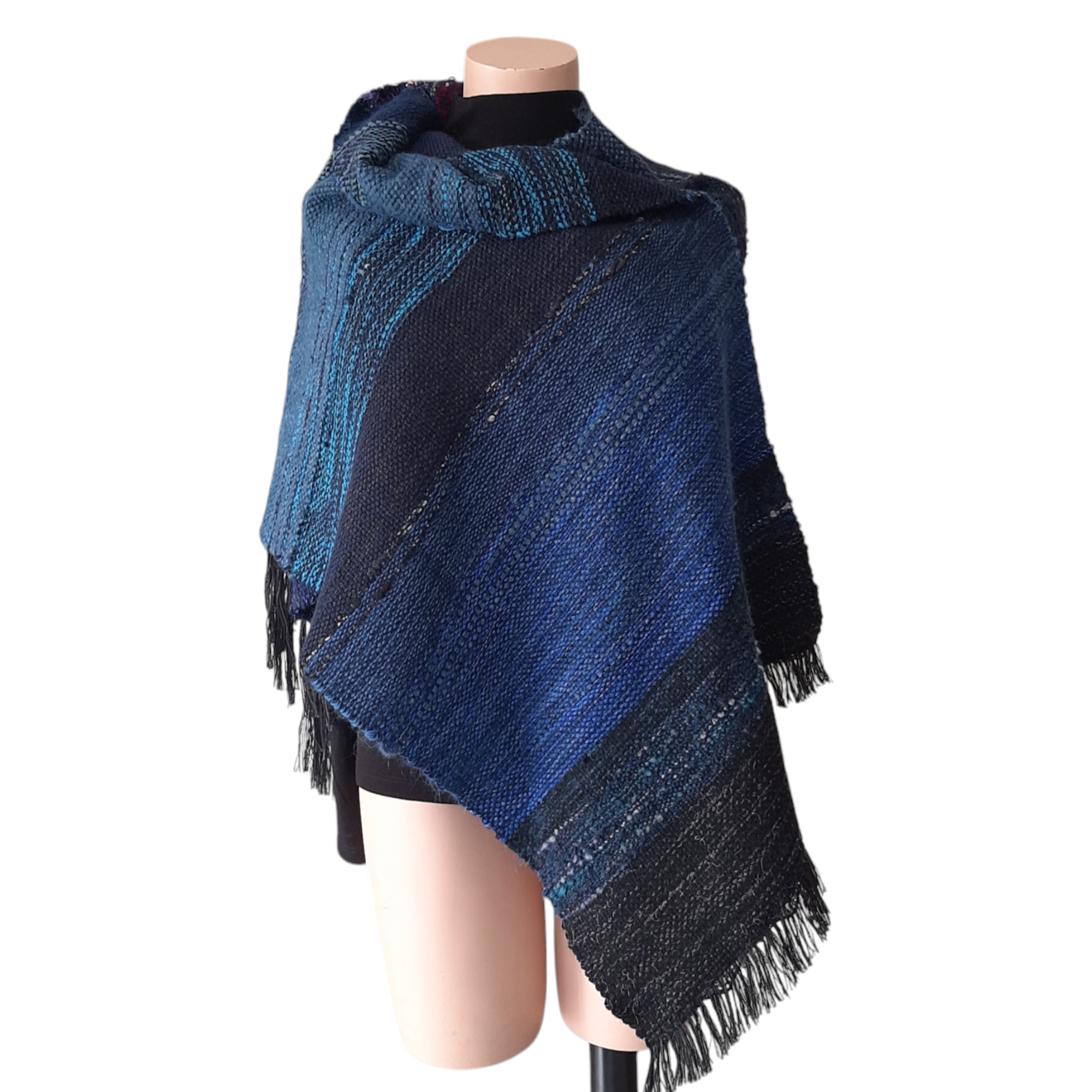 Unikaten ročno tkan šal na lesenih statvah v modrih odtenkih. Širina šala je cca 55 cm, dolžina pa 220 cm. Lahko se ga nosi tudi kot štolo ali plet v jesenskem ali pomladnem času. Sestava je 50% volne, 50% ostala vlakna kot akril, poiamid, lurex, bombaž…