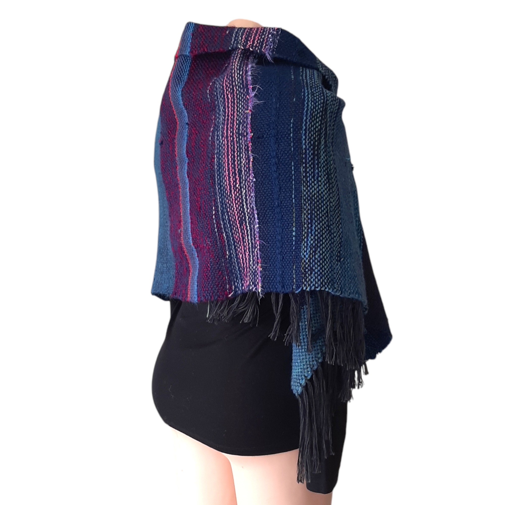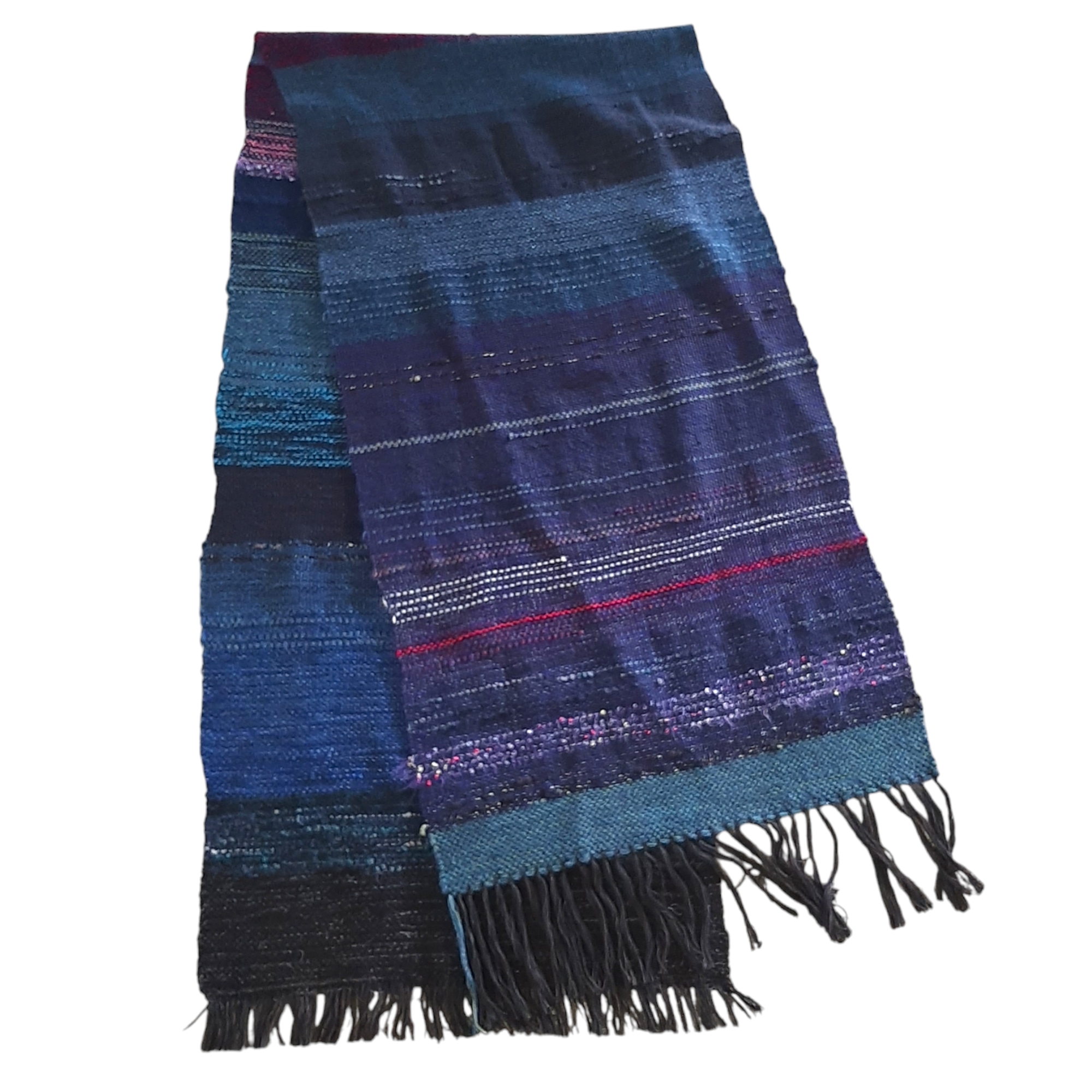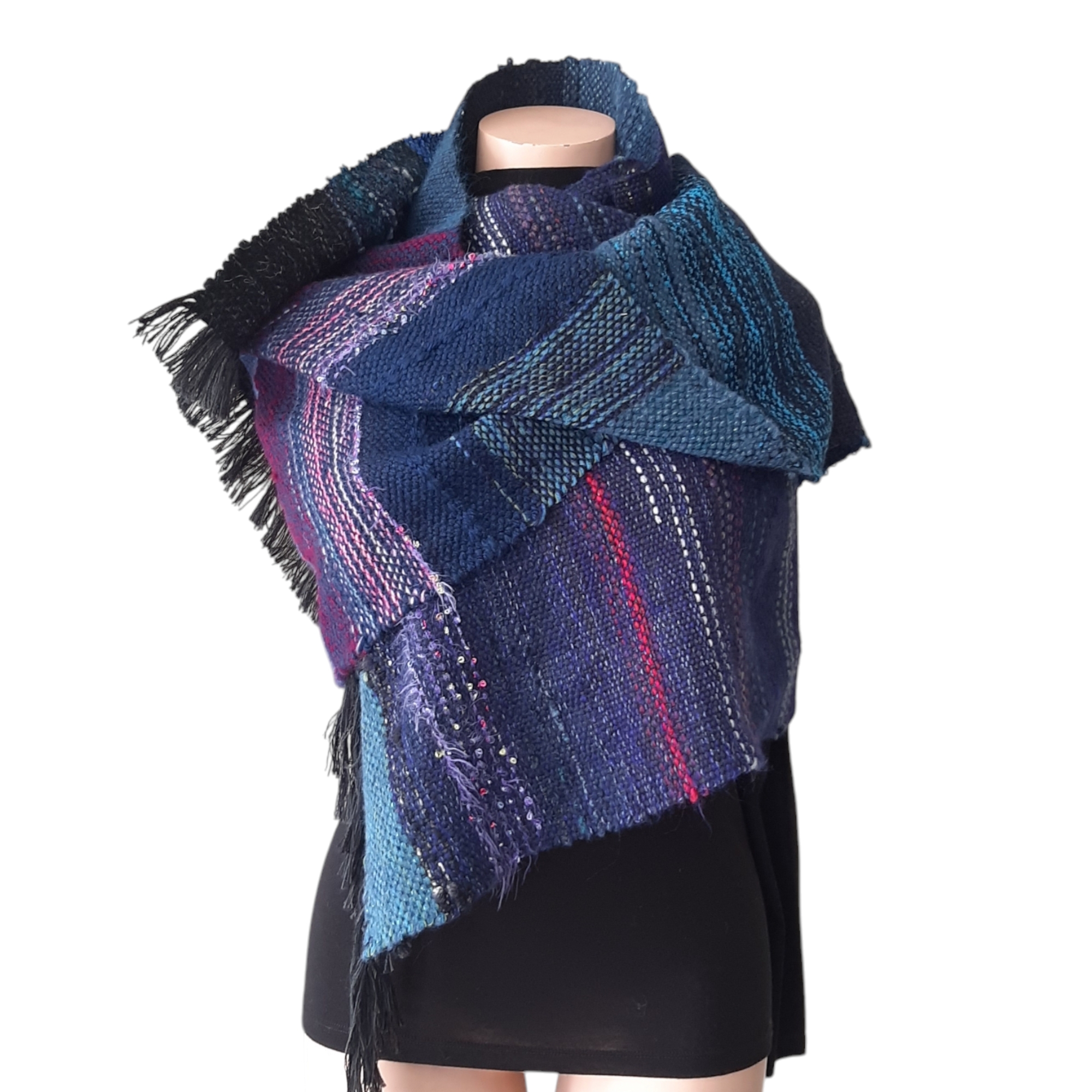 Unikaten ročno tkan šal na lesenih statvah v modrih odtenkih. Širina šala je cca 55 cm, dolžina pa 220 cm. Lahko se ga nosi tudi kot štolo ali plet v jesenskem ali pomladnem času. Sestava je 50% volne, 50% ostala vlakna kot akril, poiamid, lurex, bombaž…