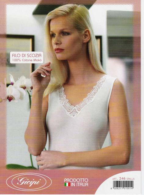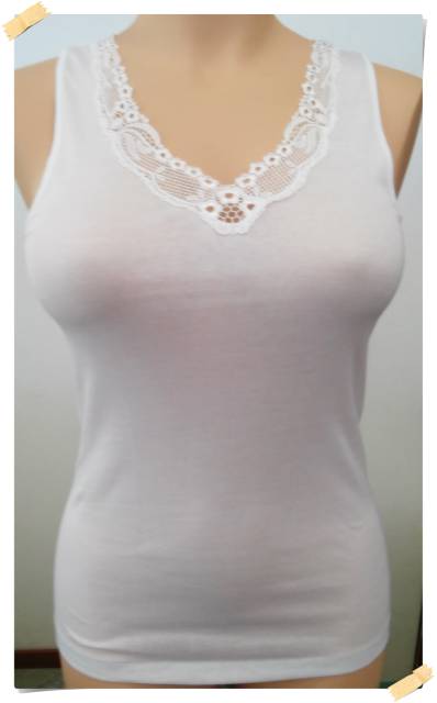 Udobna ženska majica na široke naramnice iz prijetnega tankega Mako bombaža (škotskega cvirna). Na vrhnji strani ima všito čipko.