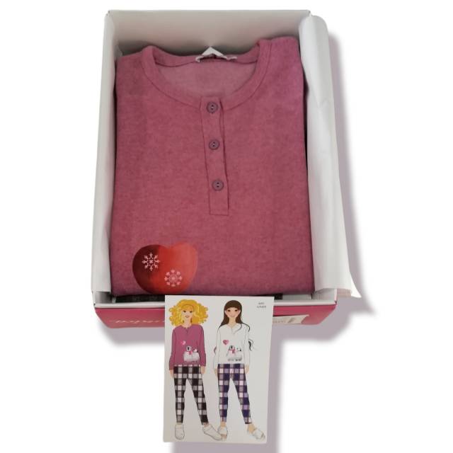 Topla ženska pižama dolg rokav narejena iz prijetnega toplejšega okosmatenega bombaža in poliestra. Na otip je zelo mehka. Pižama ima bodisi na rokavih, kot na hlačah patent. Na vrhnji strani ima prišite tri gumbe.