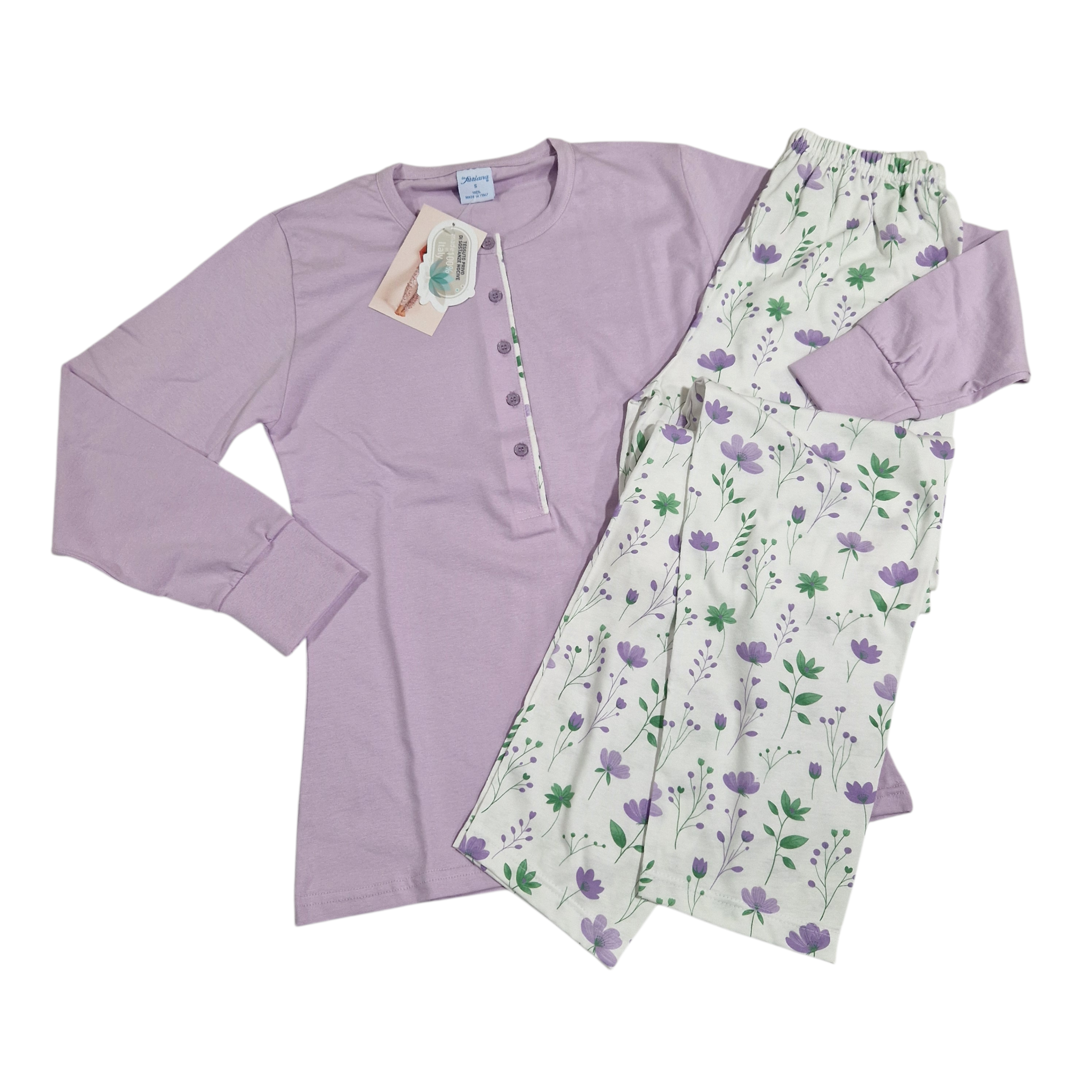 Ženska pižama dolg rokav narejena iz tankega 100% bombaža. Pižama ima rokave zaključene s patentom. Izrez vrhnjega dela je okrogel in pod njim je prišitih 5 gumbov. Dolžina hlačnic je ravna in brez patenta.