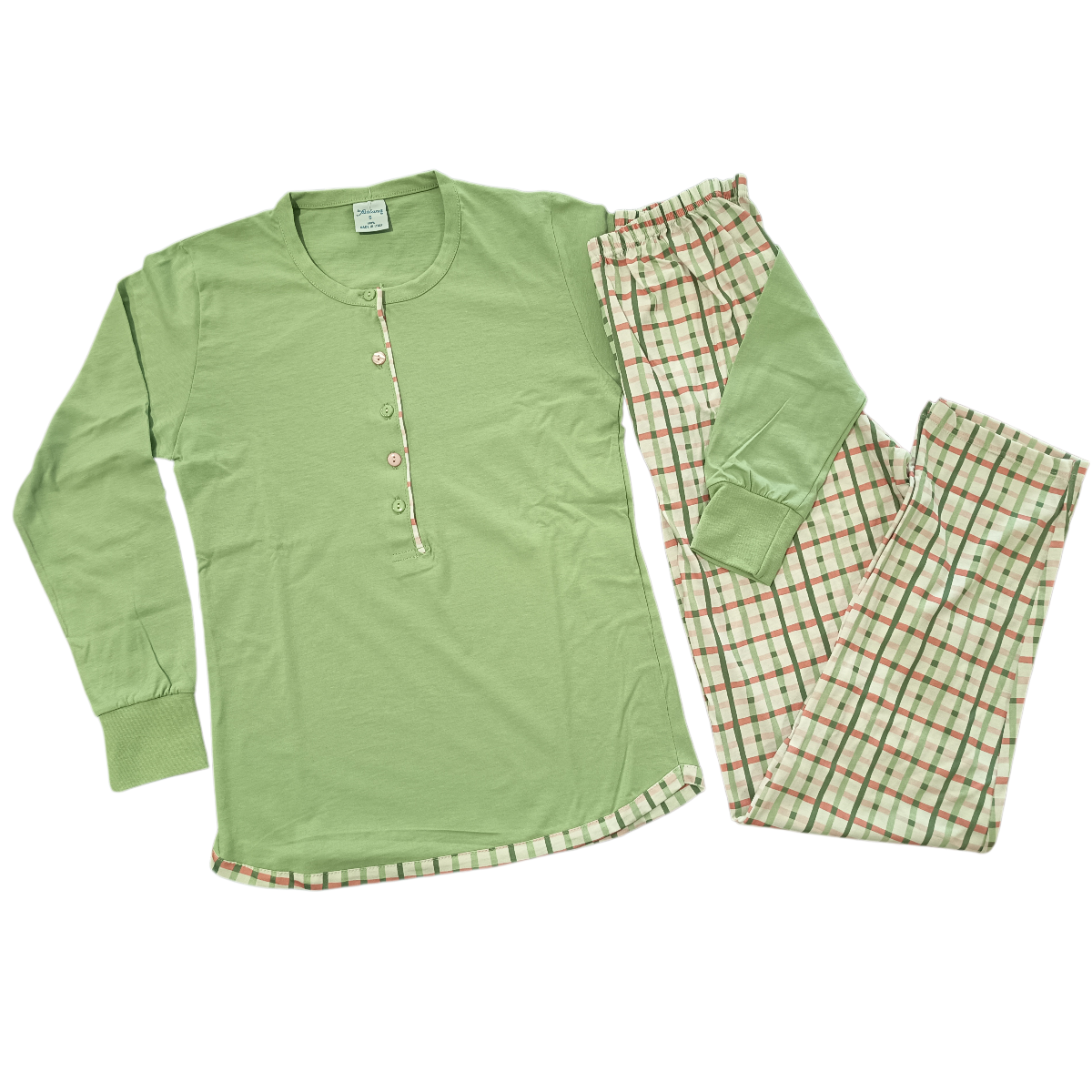 Udobna tanka ženska pižama z dolgimi rokavi je izdelana iz 100 % bombažnega (jersey), ki je izjemno mehak, zračen in prijeten na koži. Tanek material omogoča dobro zračnost, zato je pižama zelo prijetna za spanje ter udobno nošenje doma.