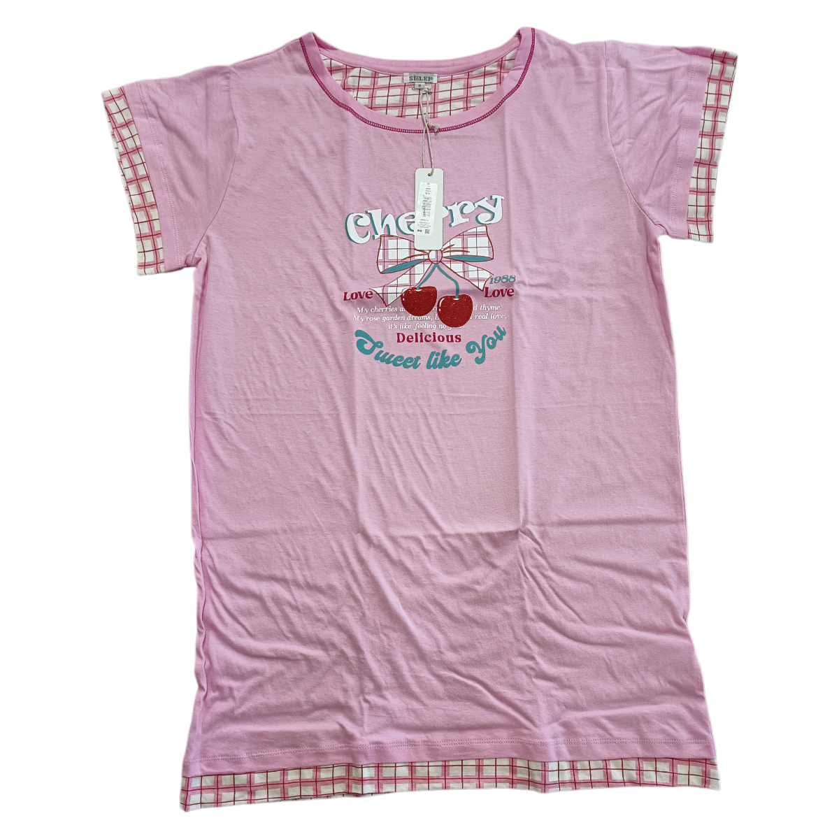 Nežen rožnat odtenek in igriv potisk s češnjami dodajata pridih svežine in ženstvenosti. Idealna izbira za vse, ki iščejo udobno, lahko in kakovostno žensko pižamo za spanje ali sproščanje doma.