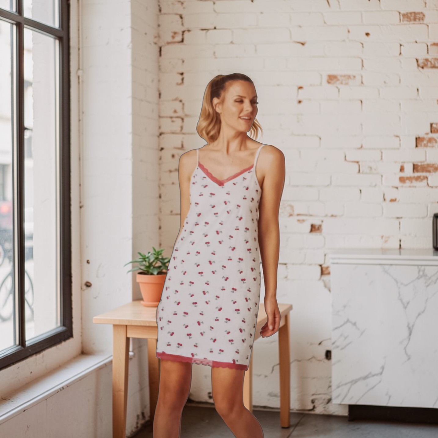Ženska spalna srajca na ozke, nastavljive naramnice je izdelana iz tankega, mehkega in zračnega bombaža, ki zagotavlja udobno spanje in prijeten občutek na koži. Idealna izbira kot poletna pižama ali lahka nočna obleka.