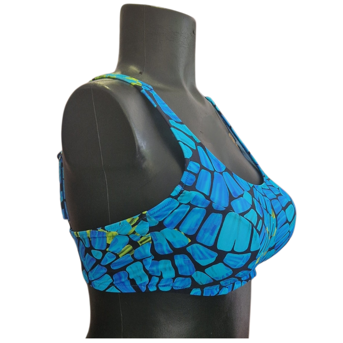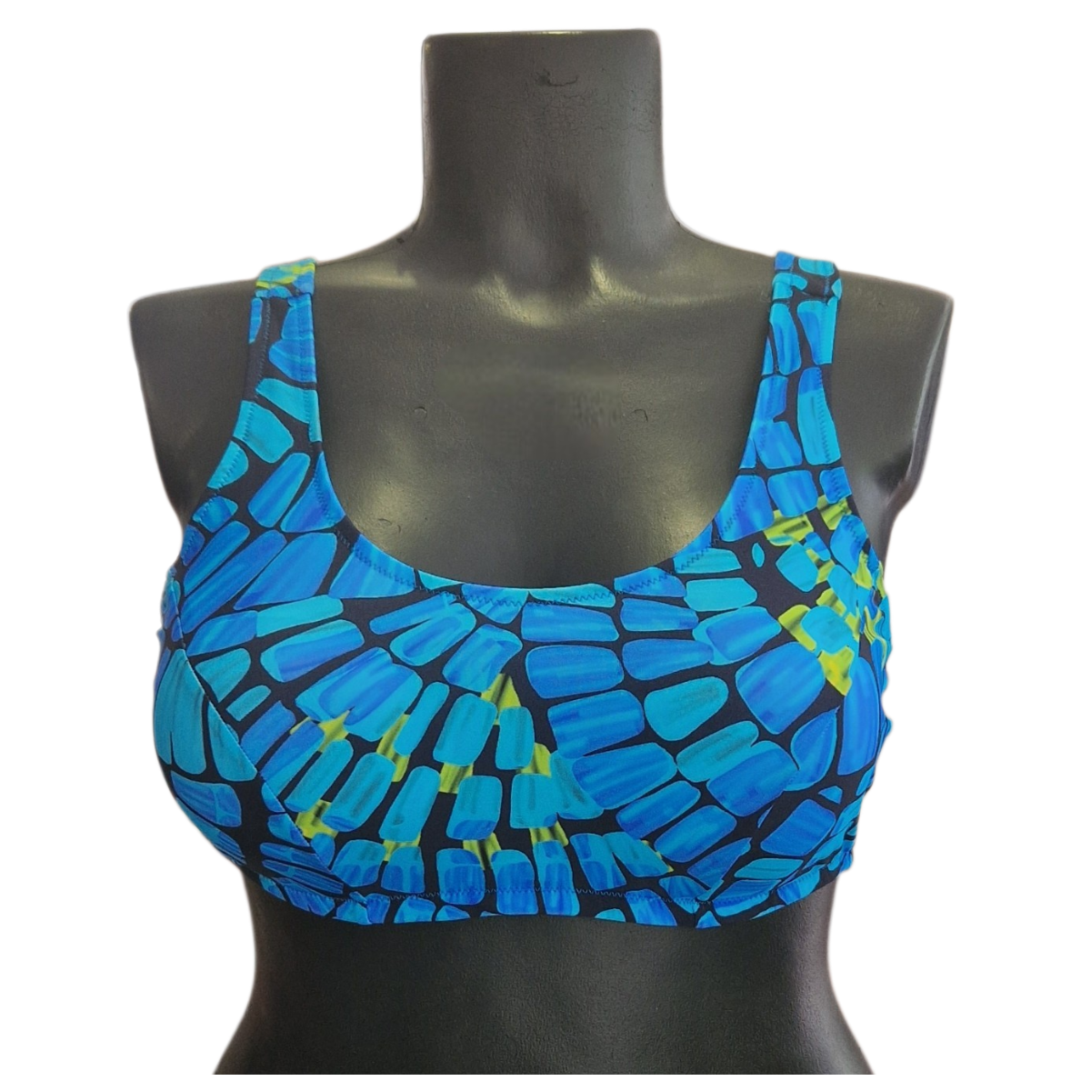 Ženske kopalke modrček z oblikovanimi košaricami brez kosti. Izgled modrčka je športen, košarice so malo oblikovane in na notranji strani imajo žepek tako, da se jih lahko dodatno podloži. Podprsni obseg je dodatno ojačen na notranji strani s tanko mrežasto podlogo. Naramnice so nastavljive, na zadnji strani se zapirajo s kovinsko sponko.