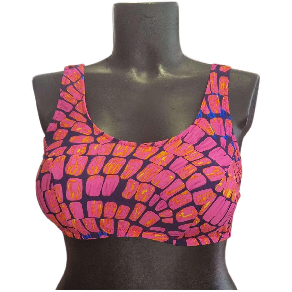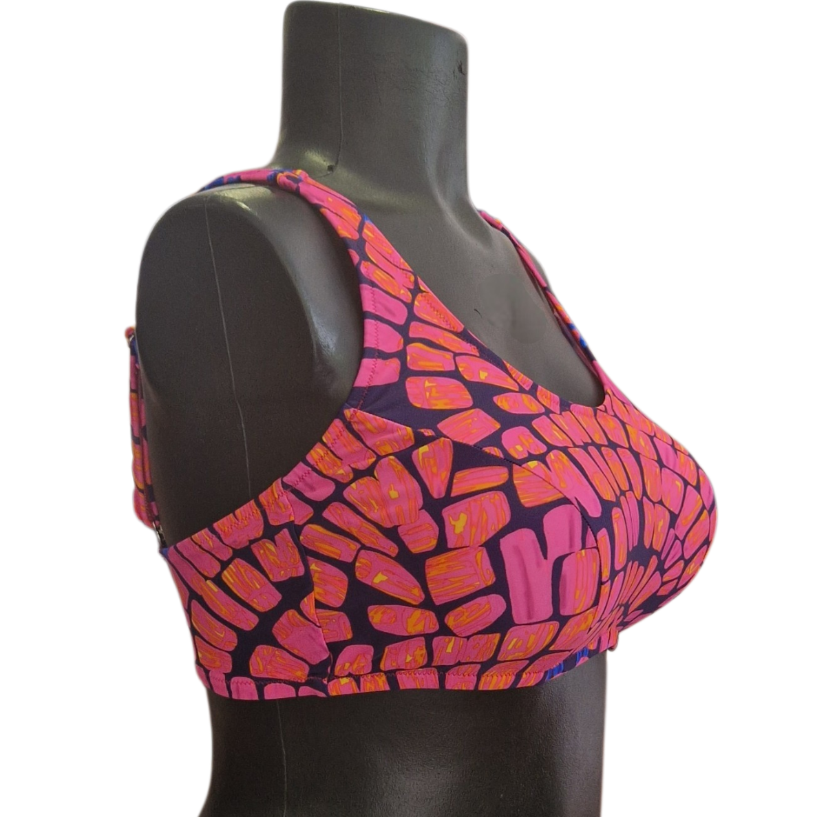 Ženske kopalke modrček z oblikovanimi košaricami brez kosti. Izgled modrčka je športen, košarice so malo oblikovane in na notranji strani imajo žepek tako, da se jih lahko dodatno podloži. Podprsni obseg je dodatno ojačen na notranji strani s tanko mrežasto podlogo. Naramnice so nastavljive, na zadnji strani se zapirajo s kovinsko sponko.