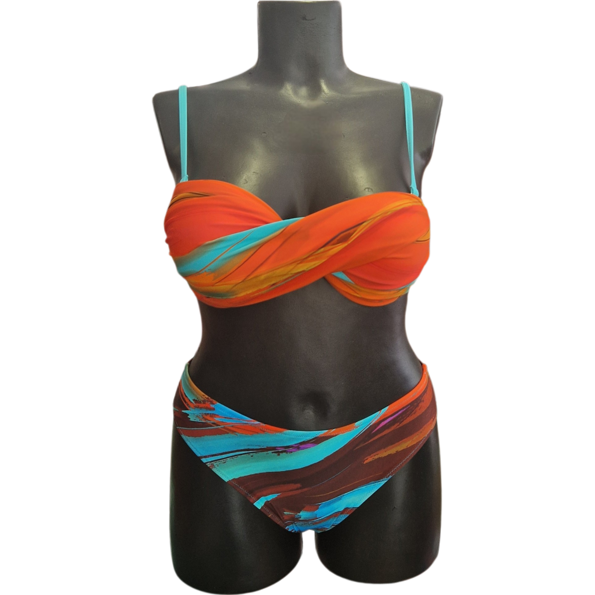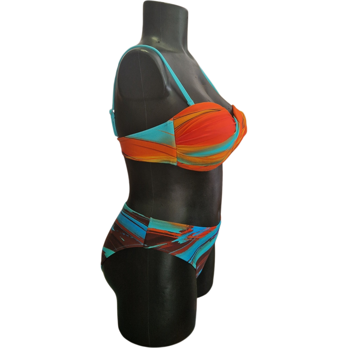 Dvodelne kopalke znamke Jolidon. Modrček je samostoječ z oblikovanimi košaricami brez kosti. Modrček ni dodatno podložen. Priložene so naramnice so nastavljive in se jih lahko ima za dodatno oporo, jih lahko nosimo navadno ali pa na križ. Na zadnji strani se zapira s kovinsko sponko.