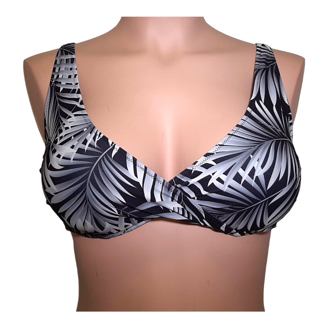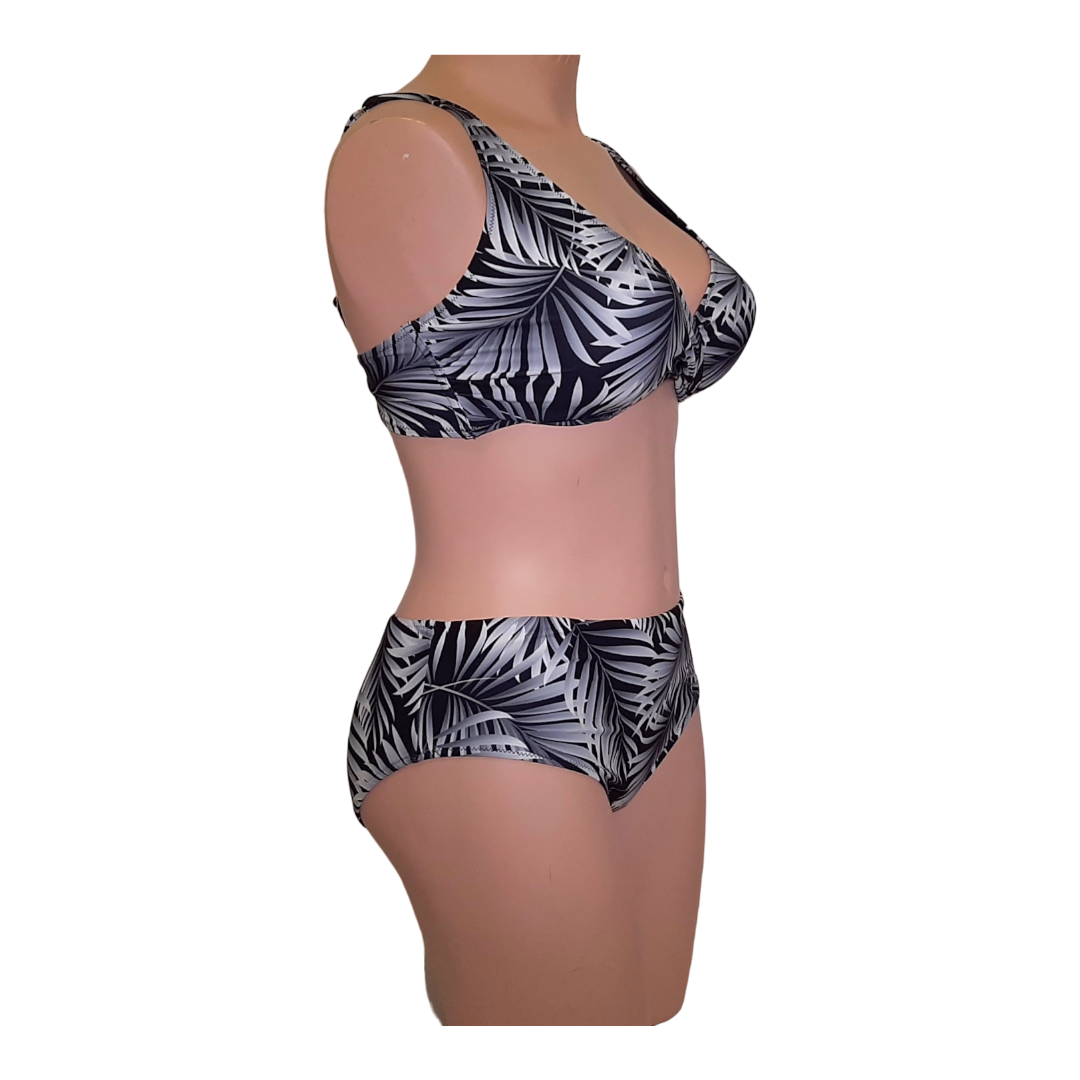 Dvodelne kopalke znamke Sielei. Modrček kopalk je brez kosti in ima oblikovano košarico. Na sprednjem delu je prekrižan in ob straneh ima dodano kost, ki daje stransko oporo. Modrček ima oblikovane košarice in ni dodatno podložen. Naramnice so nastavljive in se na zadnji strani odpnejo tako, da jih lahko zvežemo tudi okoli vratu ali pa na križ. Modrček se zapira s plastnično sponko.