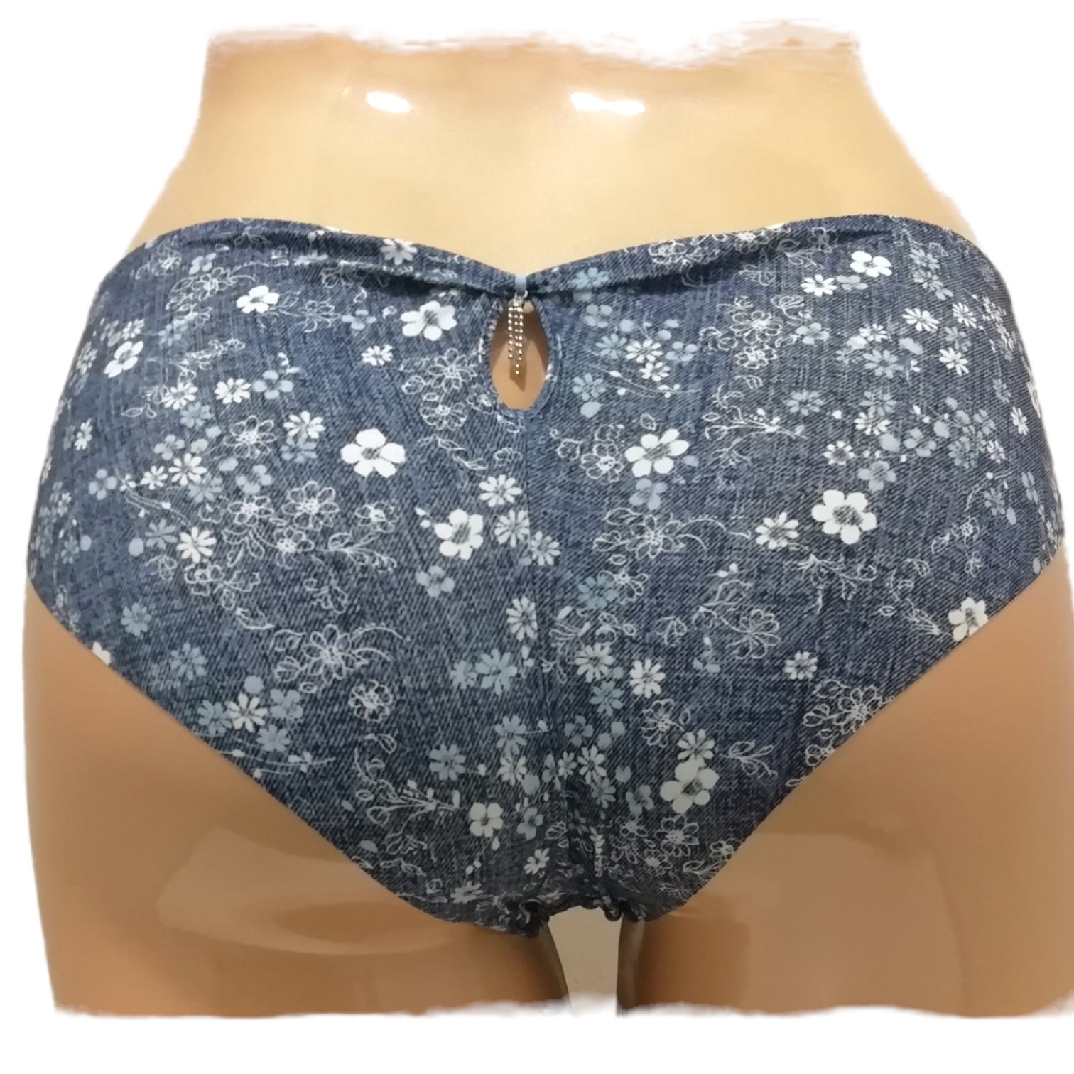 Ženske spodnje hlačke brazil. Narejene so iz tankega mehkega blaga. Na vrhnji strani so skončane z elastiko. Na zadnji vrhnji strani na sredini imajo narejeno okrasno luknjico s okraskom. Na zadni strani so skončane lazersko tako da nimajo robov in so primerne tudi pod oprijeta oblačila. Notranji vložek je bombažen.